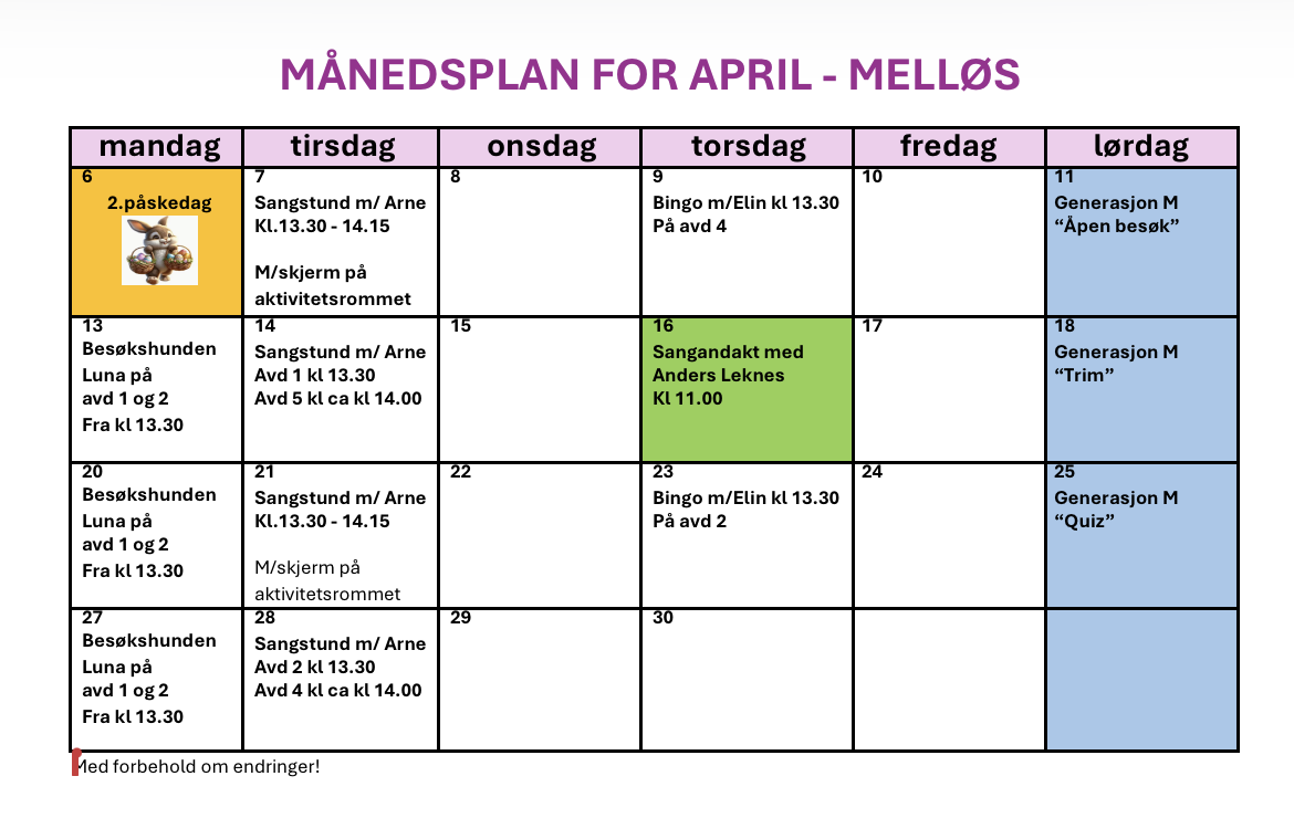 månedsplan over aktiviteter for beboerne på Melløs sykehjem
